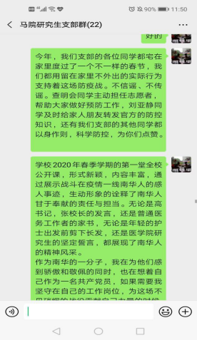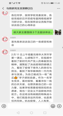 研究生刘慧芳、魏美霞、罗丹等同学表示,通过收看太阳成集团122ccvip2020年春季学期第一堂全校公开课,看到了南华人在防疫抗疫战斗中的感人事迹,看到了疫情下南华人的责任与担当,表示要从自身做起,科学防控,相信党和政府,不信谣、不传谣,引导群众坚定战胜疫情的信心。