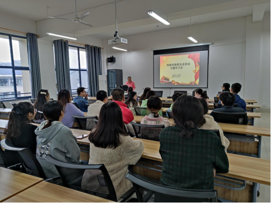 11月5日下午,公司党总支书记何小英在雨母校区崇德楼418主持开展了学习“扶贫好书记”邹海贵教授优秀事迹,公司全体无课教师和部分研究生参加了学习。