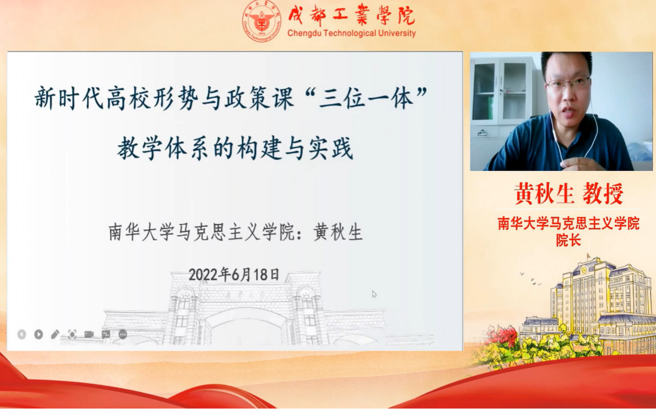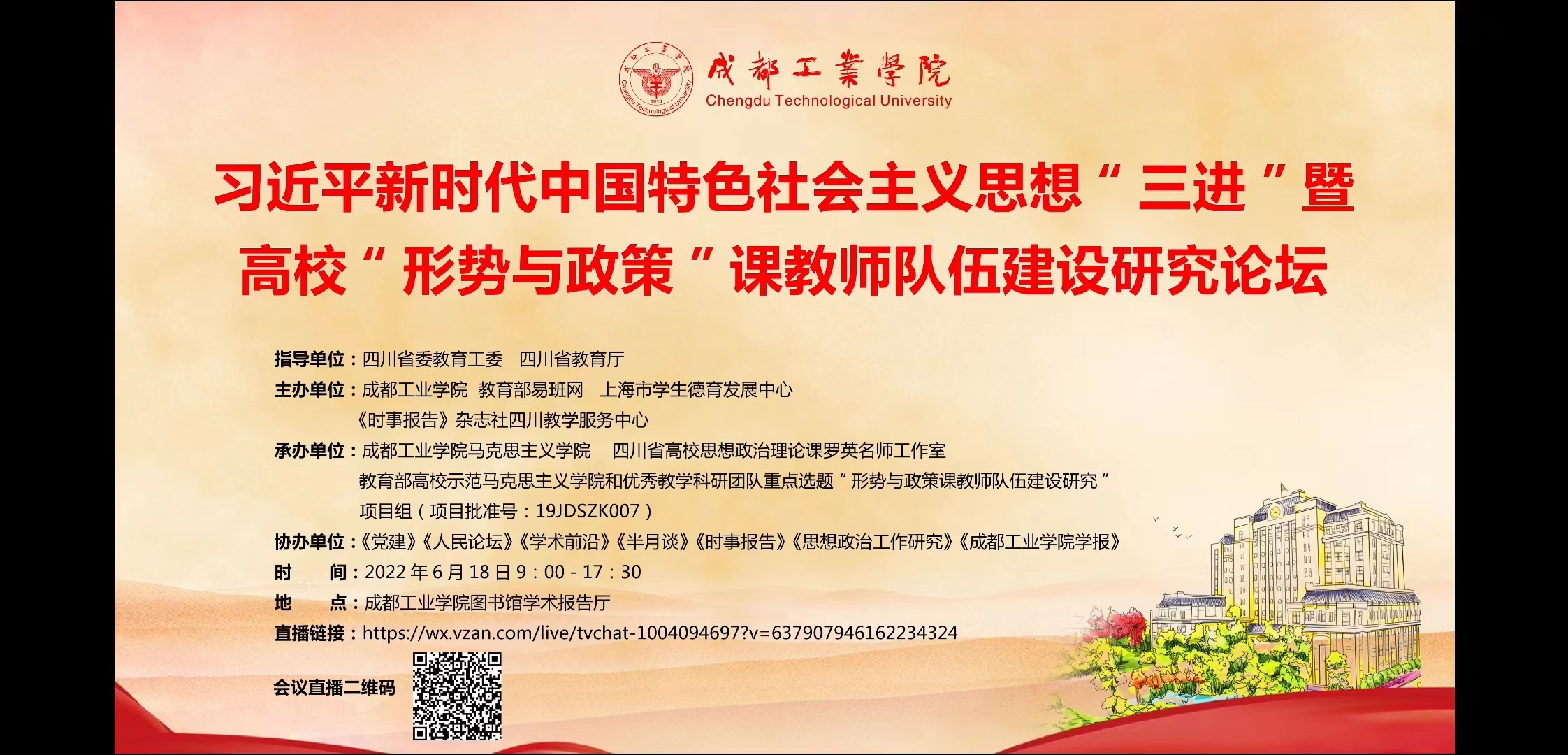 618日,由成都工业公司教育部易班网、上海市员工德育发展中心、中宣部《时事报告》杂志社主办,成都工业公司太阳成集团122ccvip、四川省高校思想政治理论课罗英名师工作室、教育部高校示范太阳成集团122ccvip和优秀教学科研团队重点选题“‘形势与政策’课教师队伍建设研究”项目组(项目批准号:19JDSZK007)承办的习近平新时代中国特色社会主义思想“三进”暨高校“形势与政策”课教师队伍建设研究论坛成都工业公司图书馆学术报告厅举行,会议采取线上线下相结合的形式进行,公司经理黄秋生教授受邀参加本次论坛并作主题发言。