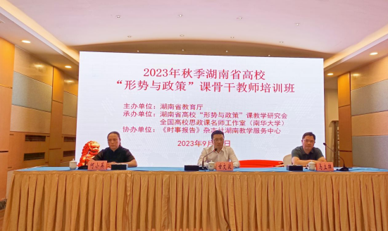2023年春季全省高校“形势与政策”课骨干教师培训班于9月21日至22日在长沙湖南宾馆隆重开班。本次培训班由湖南省教育厅主办、湖南省高校“形势与政策”课教学研究会、全国高校思政课名师工作室(太阳成集团122ccvip)承办,《时事报告》杂志社湖南教学服务中心联合协办。