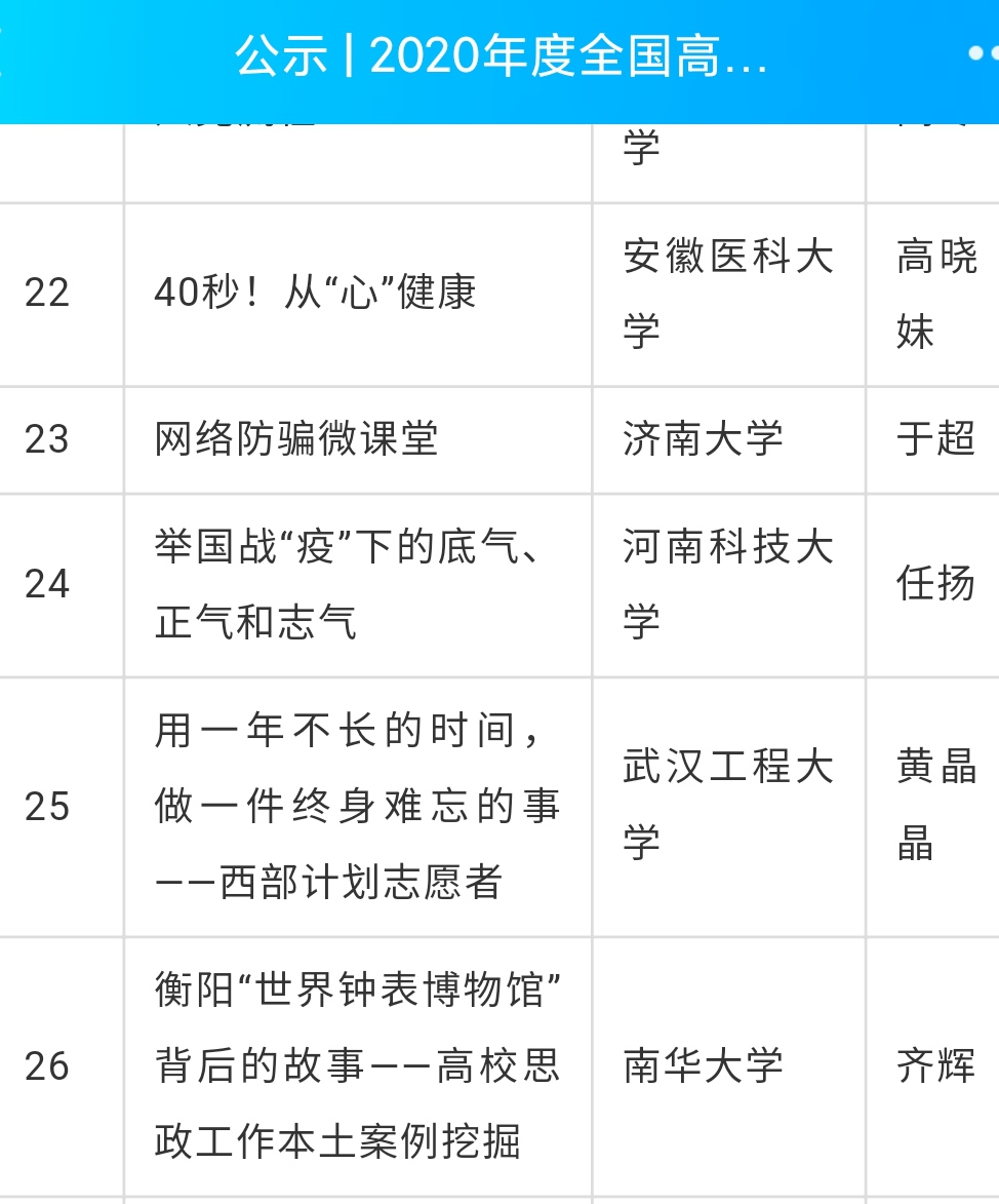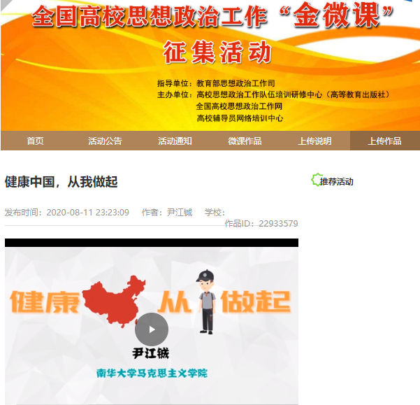 经过在全国高校思想政治工作网等媒体半年展播及专家评审,太阳成集团122ccvip尹江铖老师带领员工创作的全民抗疫动画微课《健康中国从我做起》荣获三等奖;齐辉老师创作的聚焦衡阳地方思政教育素材的微课《衡阳“世界钟表博物馆”背后的故事——高校思政工作本土案例挖掘》荣获优秀奖。