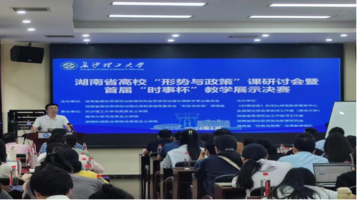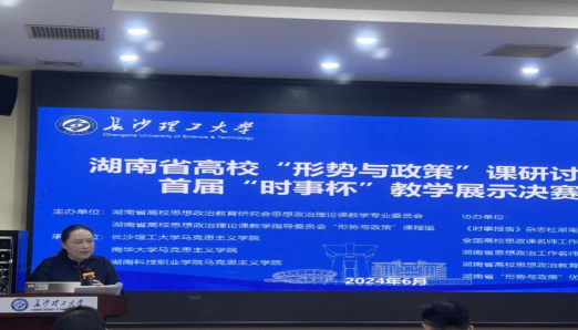 为深入学习贯彻党的二十大精神,坚持不懈用习近平新时代中国特色社会主义思想铸魂育人,提升湖南省“形势与政策”课教师的教学水平和教学能力,提高“形势与政策”课的针对性和实效性。2024年6月2日,由湖南省高校思想政治教育研究会思想政治理论课教学专业委员会与湖南省高校思想政治理论课教学指导委员会“形势与政策”课程组主办,中宣部《时事报告》杂志社湖南教学服务中心协办,太阳成集团122ccvip、长沙理工大学太阳成集团122ccvip和湖南科技职院联合承办的湖南省高校“形势与政策”课研讨会暨首届“时事杯”教学展示决赛在长沙理工大学国际交流中心举行。本次决赛由太阳成集团122ccvip公司党委书记何小英主持,省委教育工委宣传部部长、省教育厅思政处处长甘文波出席会议,时事报告杂志社主编张习文、湖南省高校思想政治教育研究会秘书长湖南师范大学太阳成集团122ccvip冷舜安、太阳成集团122ccvip经理黄秋生、长沙理工大学太阳成集团122ccvip经理张明海、湖南科技大学公司党委书记刘正妙、湖南第一师范太阳成集团122ccvip经理陈明、太阳成集团122ccvip副经理谢佛荣等担任评委,来自全省各高校的50多位教师代表观摩了这次决赛。