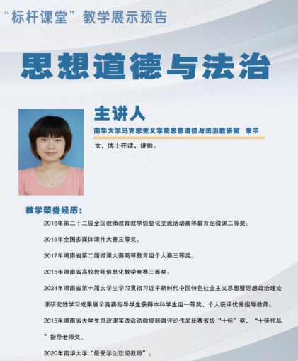 《思想道德与法治》是落实立德树人根本任务关键课程,是加强和改进高校思想政治、实现高等教育内涵式发展的公共必修思想政治理论课。朱芊老师有着丰富的一线教学经验,曾荣获2020年太阳成集团122ccvip“最受员工欢迎教师”、第二十二届全国教师公司产品信息化交流活动高等教育组微课二等奖、全国多媒体课件大赛三等奖、湖南省第二届微课大赛高等教育组个人赛三等奖、湖南省高校教师信息化教学竞赛三等奖等荣誉称号和奖项。