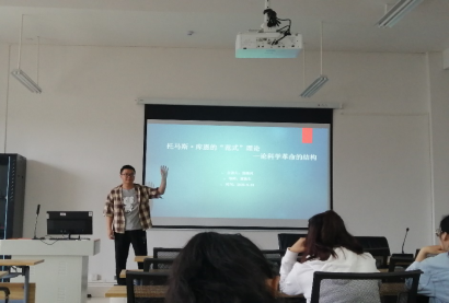 9月24日下午,太阳成集团122ccvip在雨母校区崇德楼418教室成功开展了本学期第二期学术沙龙。本次学术沙龙的主讲人为公司研二员工苗继兴,报告主题为“托马斯·库恩的‘范式’理论——论科学革命的结构”,参与者有马院研究生30余名。