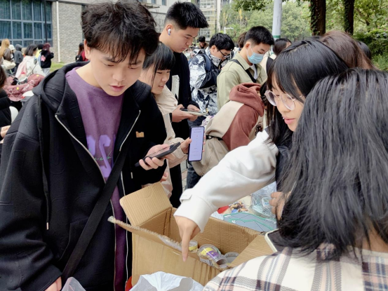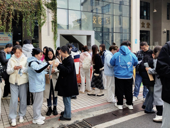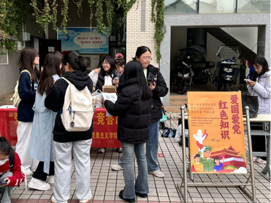 虽然天气转凉,但活动现场气氛火热,雨母校区在校生怀抱强烈的热情,在知识的海洋中竞相遨游,共有249名同学参与本次活动并获得心仪奖品。本次问答活动设置了十二组关于“爱国爱党红色知识”的选择题,每组分设十二个题目,涵盖中国近现代史、党的二十届三中全会、马克思主义基本原理等六个模块的重要内容。参与活动的同学通过随机扫描二维码题目,经思考后去干事面前作答,而后依据正确数量领取不同类别的奖品。组织和负责活动的干事热情高涨,参与活动的同学积极主动,笃行园食堂门口洋溢着青春的气息。