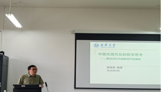邹海贵教授分享的主题是《中国式现代化的哲学思考——兼谈当代中国新现代性构建》。首先,邹教授带领同学们探究“现代化”与“现代性”的概念差异,并分析了现代性目前存在的悖论、弊端与矛盾,指出形式化自由与机会平等的局限性,以及制度理性与个体感性之间的矛盾等。之后,他从中国式现代化与西方现代化的差异出发,强调二者虽在科学技术理性、市场经济、民主政治等方面存在共性,但中国式现代化具有社会主义本质的特殊属性,人民性是中国式现代化的核心属性。这种人民性体现在中国式现代化致力于实现全体人民共同富裕,坚持把实现人民对美好生活的向往作为现代化建设的出发点和落脚点,着力维护和促进社会公平正义。与西方以资本为中心的现代化不同,中国式现代化摒弃了两极分化和物质主义膨胀的老路,走出了一条立足中国国情、体现社会主义原则的现代化新路。最后,邹教授提出了构建中国新现代性的可能路径——工具理性与价值理性的统一、历史理性与价值理性的统一、理论理性与价值理性的统一、实践理性与价值理性的统一,最终使得中国新现代性更好地服务中国式现代化建设。