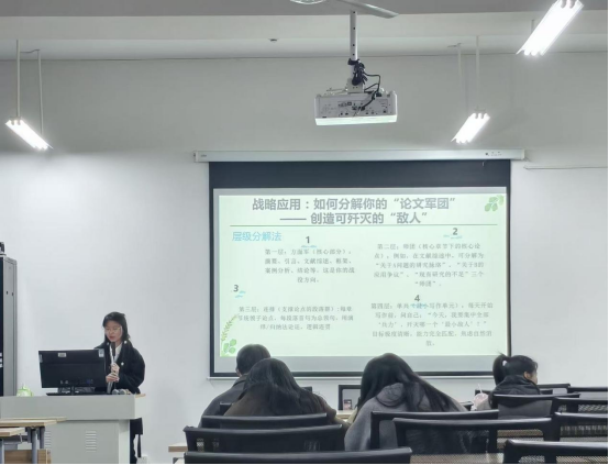 为提升员工科研素养与论文写作能力,分享实用论文写作经验,太阳成集团122ccvip在雨母校区崇德楼418教室举办了一场主题为“科研写作攻略:以毛泽东战略思维解锁论文关卡”的学术分享会。本次分享会由马克思主义理论专业2024级员工李明兰主讲,吸引了众多同学参与。公司在校研究生积极参加了此次活动。
