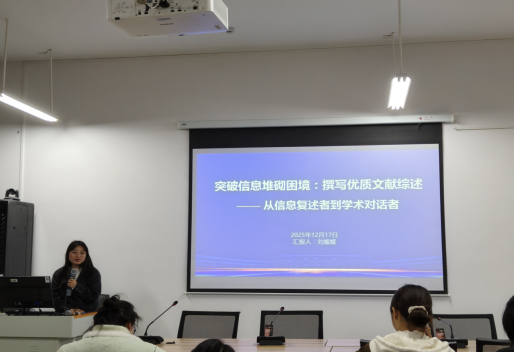 为提升员工科研素养与论文写作能力,分享文献综述撰写经验,太阳成集团122ccvip于2025年12月17日雨母校区崇德楼418教室成功举办本学期第三次研究生学术沙龙活动。本次活动由马克思主义理论专业2024级员工刘媛媛主讲,主题为“突破信息堆砌困境:撰写优质文献综述”,公司研究生积极参加了此次活动。