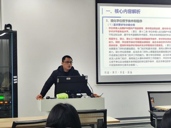 谢佛荣副经理首先围绕《中华人民共和国学位法》的核心内容进行了详细解析,包括学位工作的基本原则、学位授予资格与条件、学位授予程序与质量保障等方面。他强调,学位法不仅规范了学位授予工作,更是对学术诚信和学术道德的有力保障。
