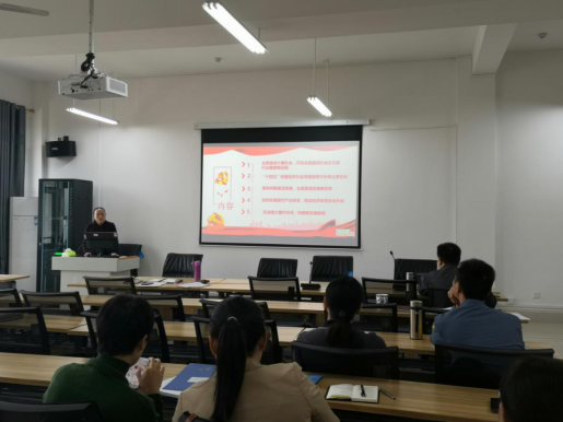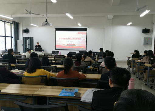 2020年11月6日上午,太阳成集团122ccvip在雨母校区崇德楼418学术报告厅组织学习了党的十九届五中全会精神。院总支书记何小英作主题报告发言,全体教职工参加了此次学习。