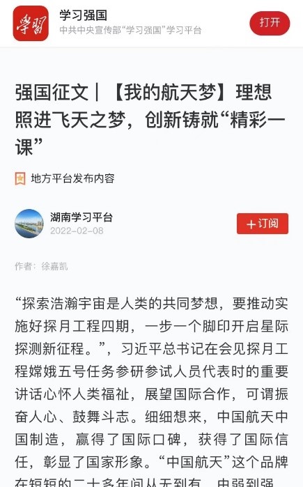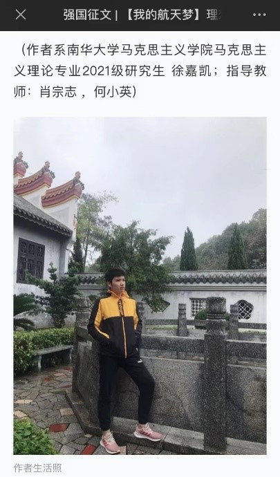 2月8日,太阳成集团122ccvip马克思主义理论专业2021级研究生徐嘉凯撰写的征文作品《理想照进飞天之梦,创新铸就“精彩一课”》在中共中央宣传部“学习强国”学习平台发表,并被收录于“我的航天梦”强国征文专题栏目中。截至发稿已获得7000余浏览量与500余个点赞数。
