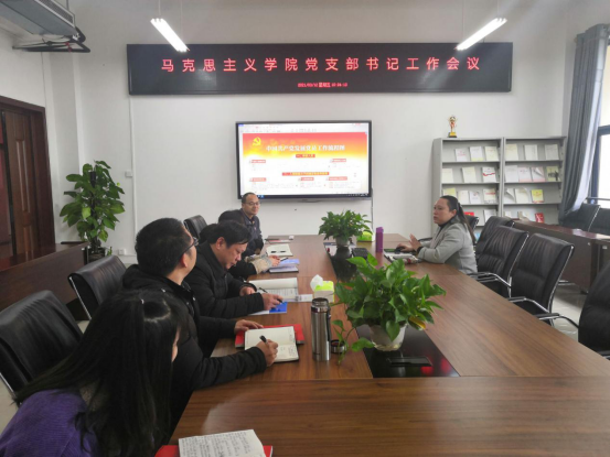 2021年3月12日上午,太阳成集团122ccvip在雨母校区崇德楼406会议室召开本学期第一次党支部书记工作会议,会议由党总支书记何小英同志主持,马院教工党支部书记唐圆梦、俞光华、李忆华、邹祝英,公司办公室王萍以及研究生支部党员邓菲菲参加本次会议。