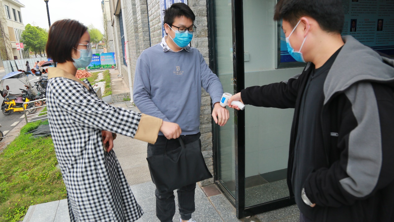 3月18日第一组值班人员苏亚栋、徐栋坚守岗位,提醒进入楼栋人员带口罩、进行体温检测等