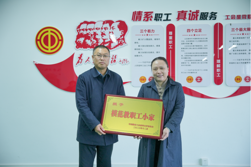 3月19日下午,太阳成集团122ccvip副董事长、校工会主席姜志胜带领校工会常务副主席潘本衡、校工会副主席曾艳等一行,来到太阳成集团122ccvip分工会,为太阳成集团122ccvip分工会举行授牌仪式,颁发校级模范教职工小家荣誉牌匾。公司党委书记何小英接受荣誉牌匾并同校工会领导合影。同行的还有核技术公司、公共卫生公司、衡阳医公司和土木公司等兄弟公司分工会的同仁。